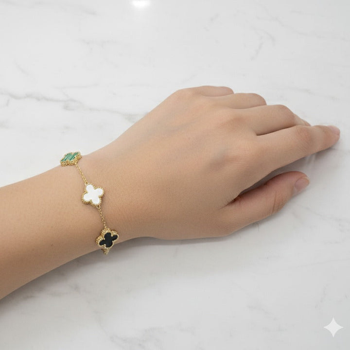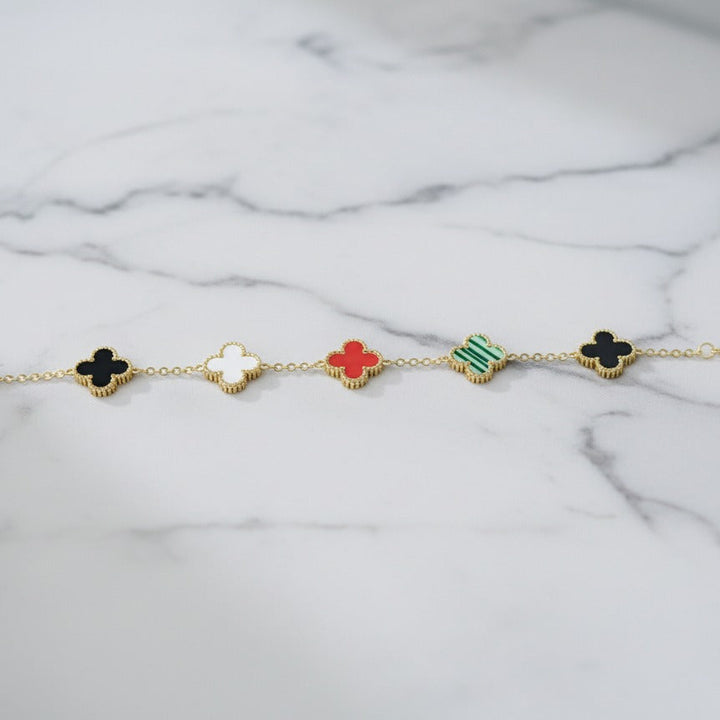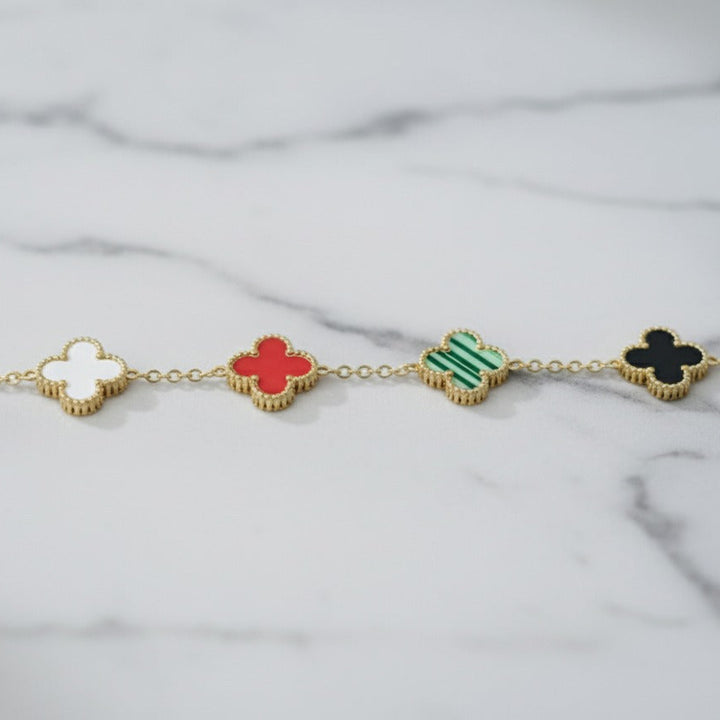 Add a vibrant touch of elegance to your look with the Multi-Color Clover Bracelet, a stunning blend of color and sophistication. Featuring signature clover motifs in a variety of rich enamel shades, each charm is beautifully bordered with a radiant gold outline. This eye-catching bracelet brings together playfulness and luxury, making it the perfect accessory to brighten any outfit — from everyday wear to special occasions.