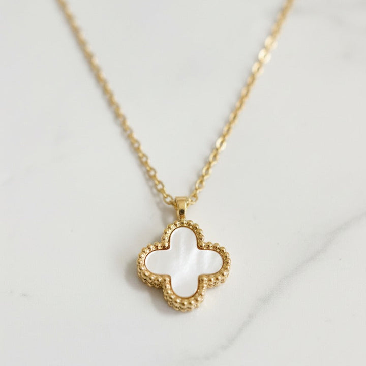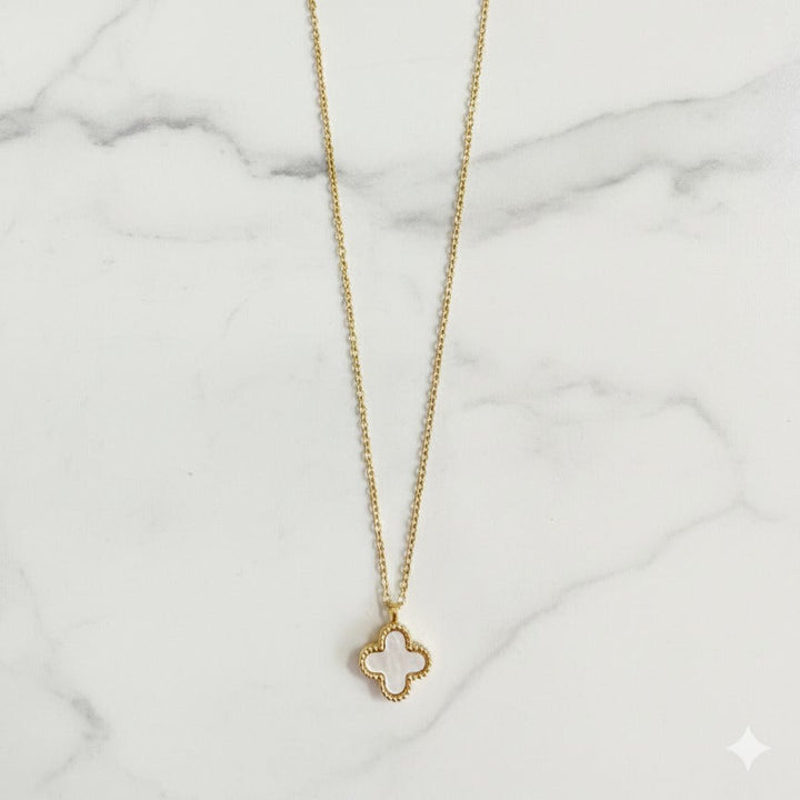 Radiate grace and sophistication with the White Cleef Necklace, a timeless piece that embodies purity and elegance. Featuring signature white enamel clover motifs beautifully bordered with a lustrous gold finish, this necklace adds a refined charm to any outfit. Whether for a classy daytime look or an evening occasion, the White Cleef Necklace offers a perfect balance of modern allure and classic beauty.